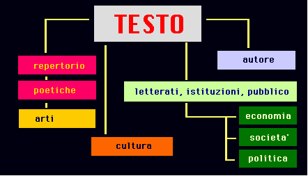 Nella figura ogni legame del testo con una serie problematica rappresenta altrettante metodologie di interpretazione, che la critica letteraria ha elaborato e che propone ai lettori, in particolare agli studenti. Dopo aver analizzato il testo letterario infatti, lo si puo' interpretare collocandolo in un contesto per praticare uno o piu' paradigmi interpretativi. Il testo rinvia infatti a quattro principali approcci interpretativi: uno di carattere letterario, non alieno anche al confronto tra letteratura ed altre esperienze artistiche; uno di carattere semiologico, incentrato sul confronto tra temi letterari e cultura coeva; uno di carattere sociologico, interessato alle condizioni sociali di produzione e fruizione della letteratura, e del lavoro intellettuale in generale, interessato anche alle piu' generali problematiche storiche; uno di carattere biografico, o psicologico, attento al rapporto dell'opera con la vita del suo autore, ma anche alla manifestazione nell'opera del mondo interiore dell'artista.