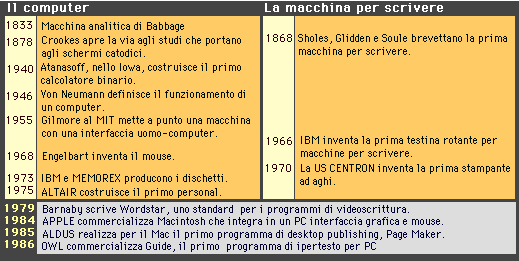 Tuttavia gli utensili che servono per scrivere a mano (penna) o per dattiloscrivere (i tasti della macchina) hanno una caratteristica comune: agiscono immediatamente sulla carta. La metamorfosi che conduce alla videoscrittura comincia da qui, dal dissociare il funzionamento degli utensili dall'azione immediata sulla carta. L'altro mutamento avviene quando alla macchina per scrivere elettrica si assegna un po' di memoria interna per conservare solo temporaneamente quantita' piu' o meno ampie di testo: cio' rende piu' agevole fare correzioni. Infine alla memoria interna si aggiunge una memoria esterna su supporto mgnetico, una cassetta prima, poi un dischetto. La svolta definitiva si ha quando si cominica a usare uno schermo per visualizzare la scrittura ed infine quando queste macchine sono connesse ad un computer, che nel frattempo, indipendentemente dalla videoscrittura ha sviluppato le proprie tecnologie.